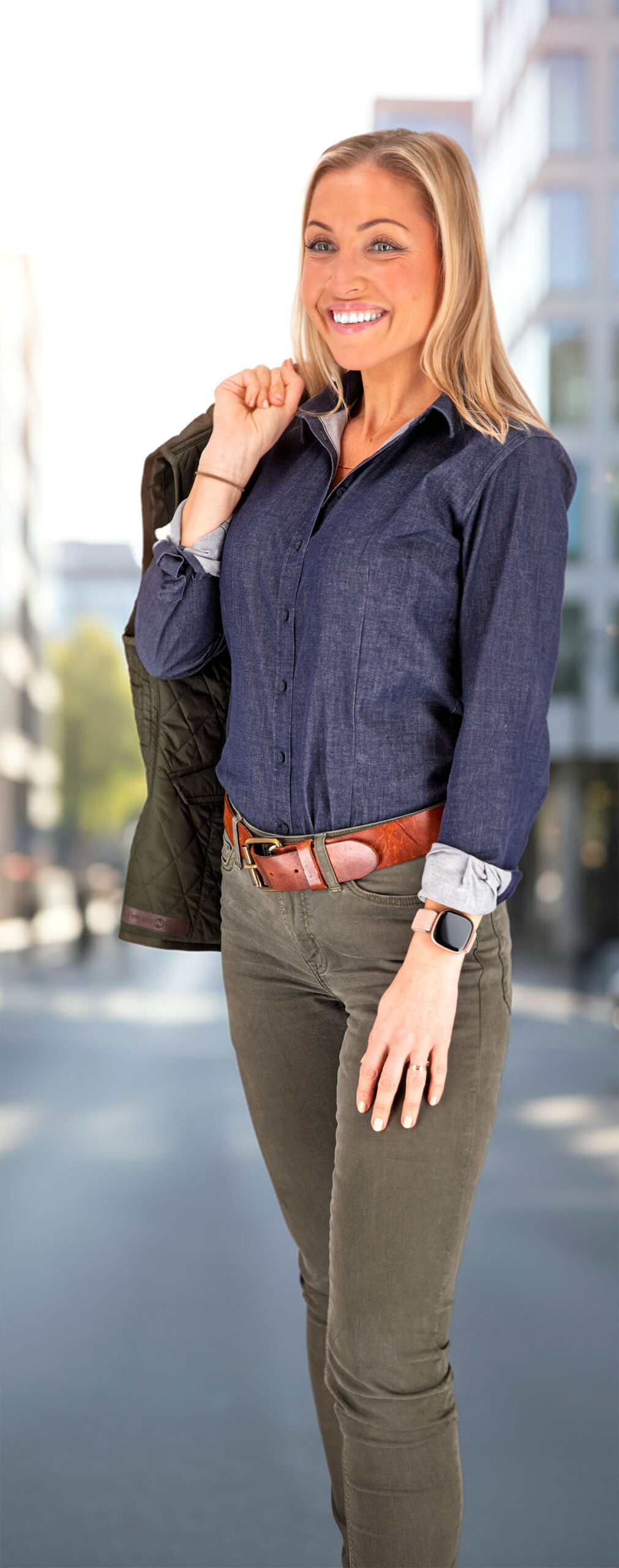 Silje fra Markedsavdelingen har valgt denimskjorten Torrance sammen med den lette, vatterte vesten Camden.